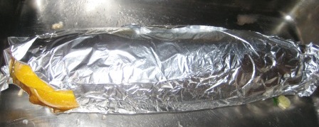 So I place the two halves together and wrap them in foil and placed them in a large baking dish.